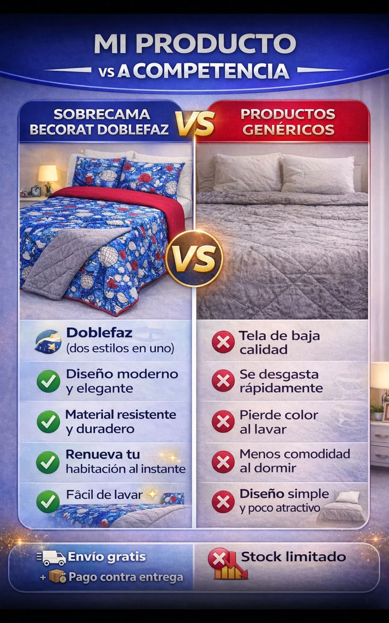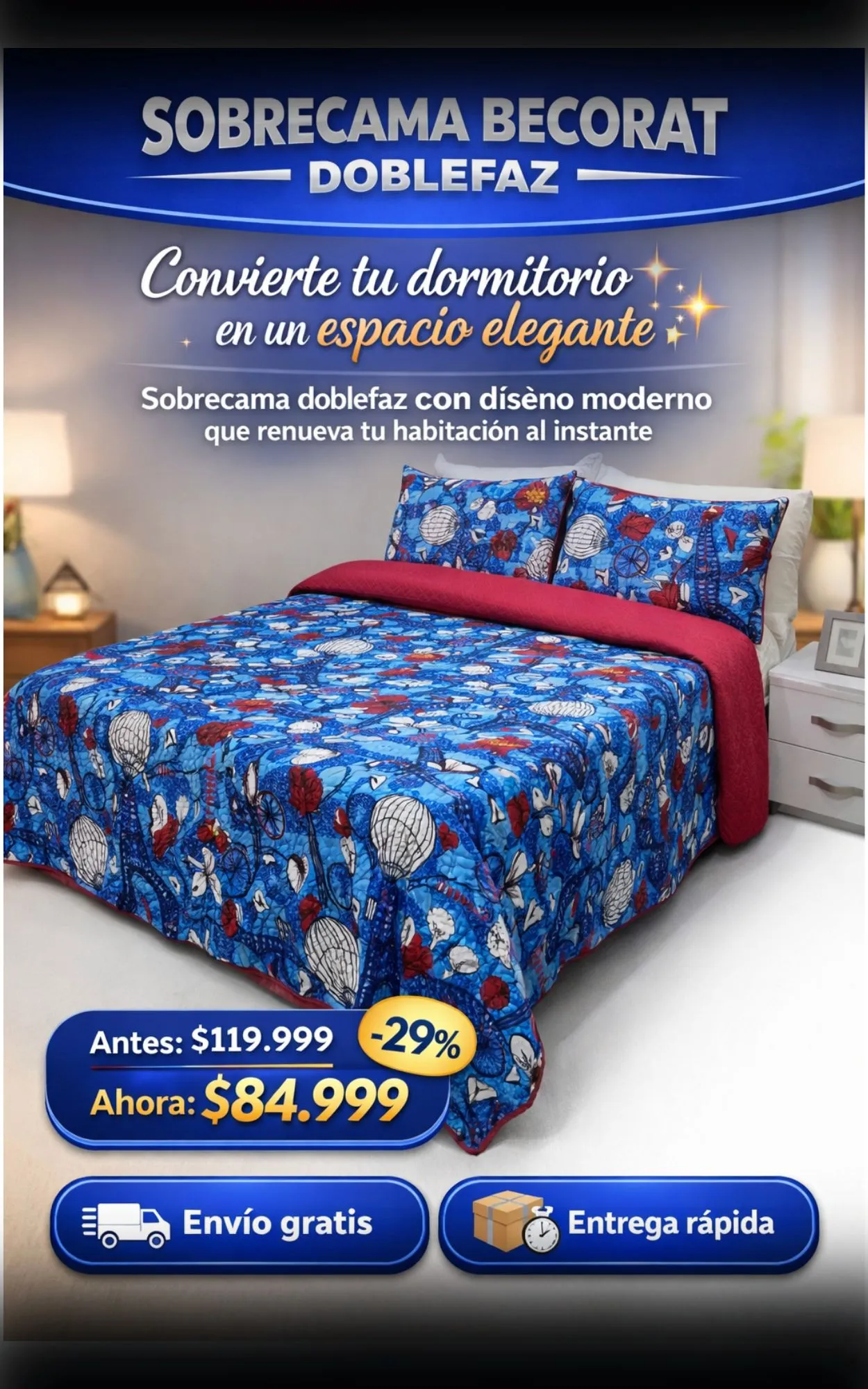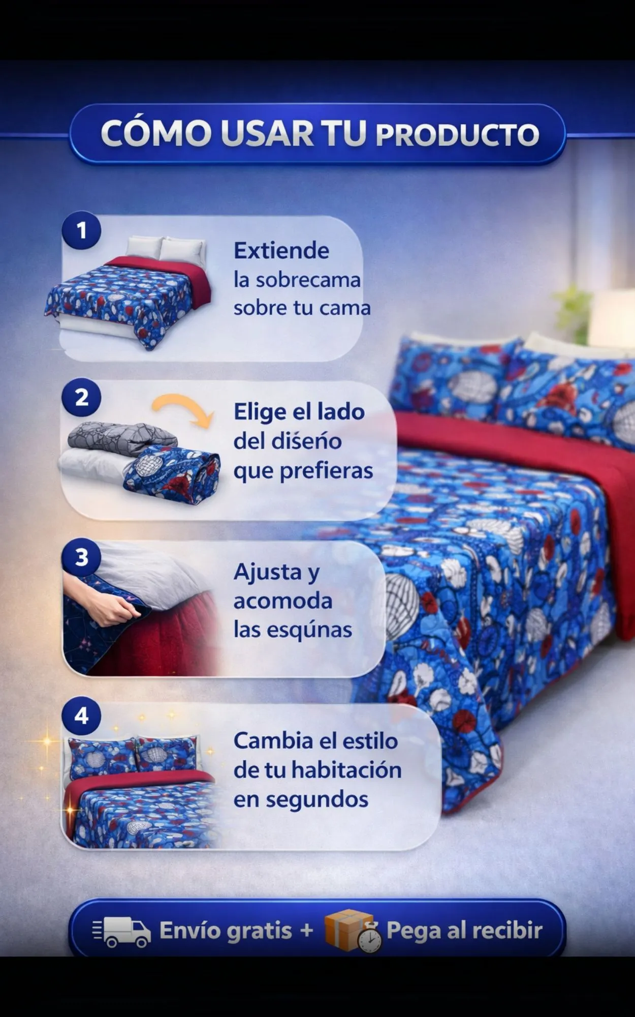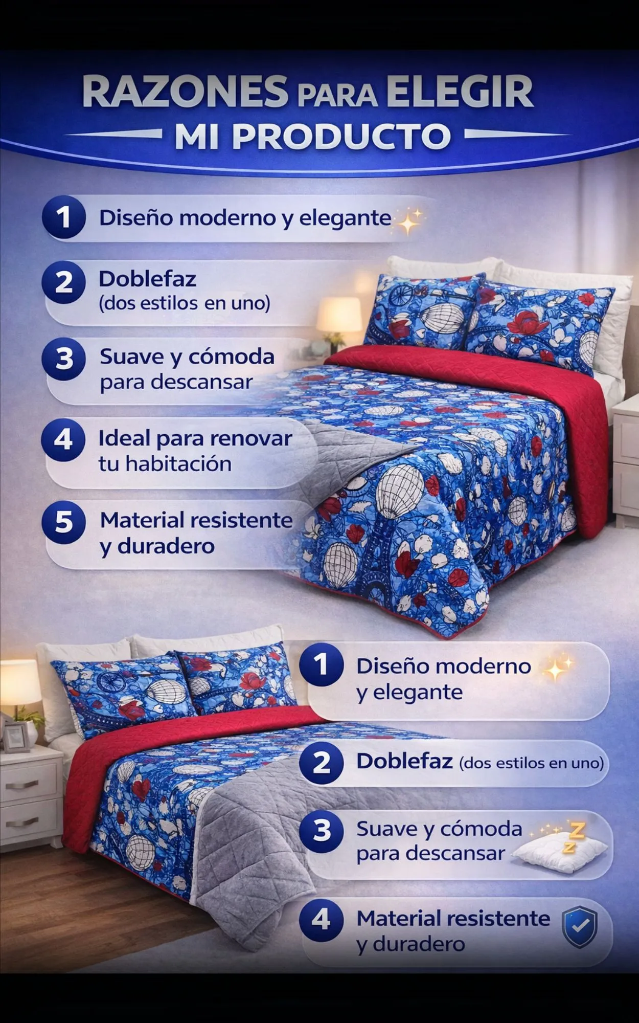 Sí. Tiene dos diseños en una sola pieza, solo debes darle la vuelta para cambiar el estilo de tu habitación.